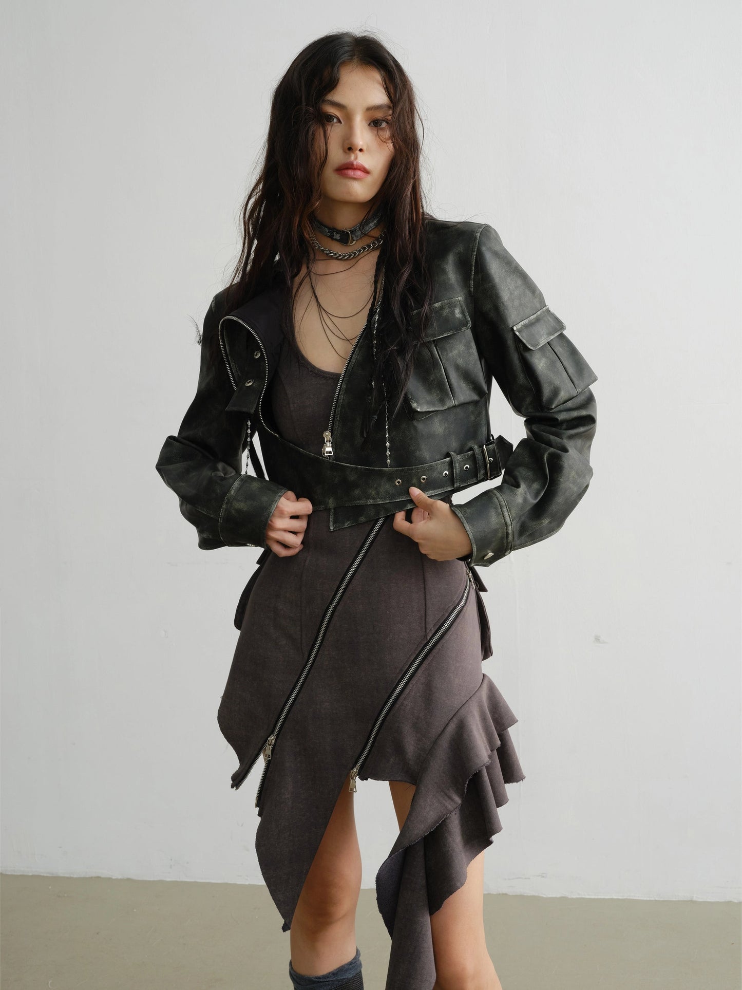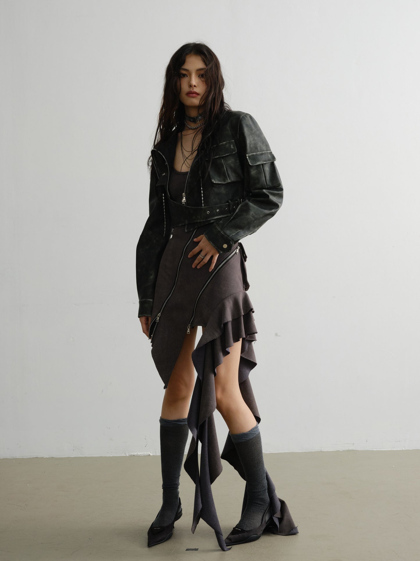 Punk Irreguläres Reißverschlussverziertes Rüschen Minikleid
