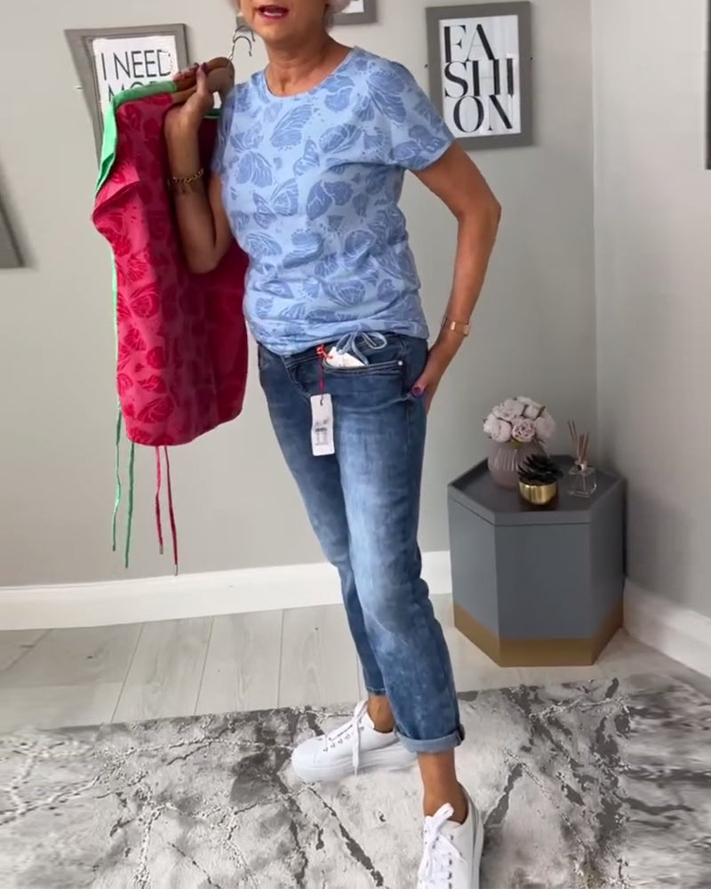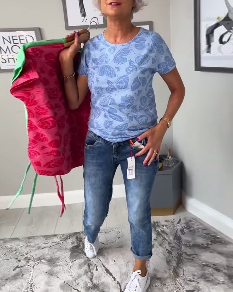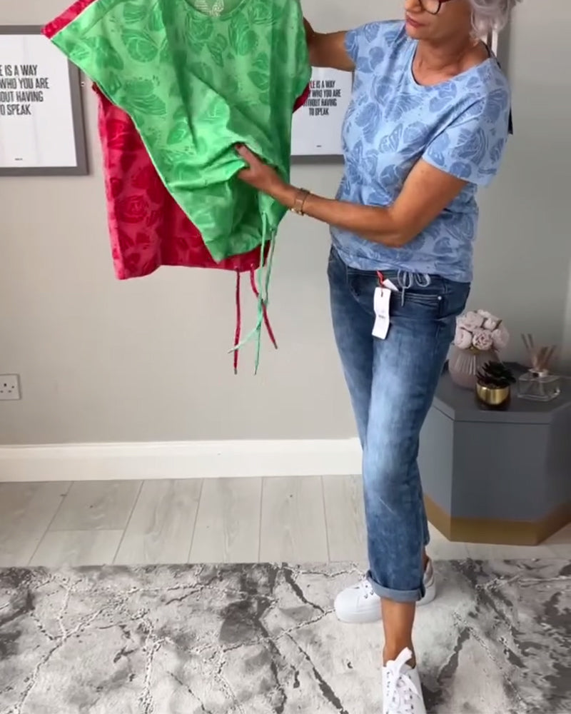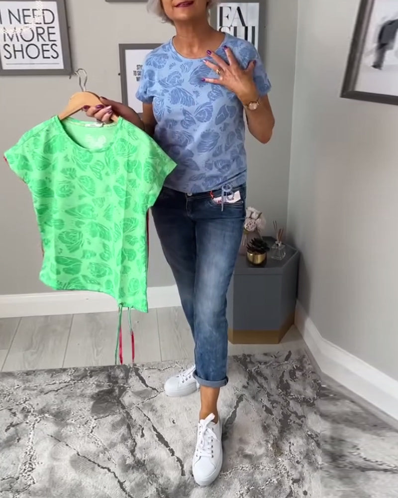 Rundhalsoberteil mit Kordelzug und Schmetterlings-Print