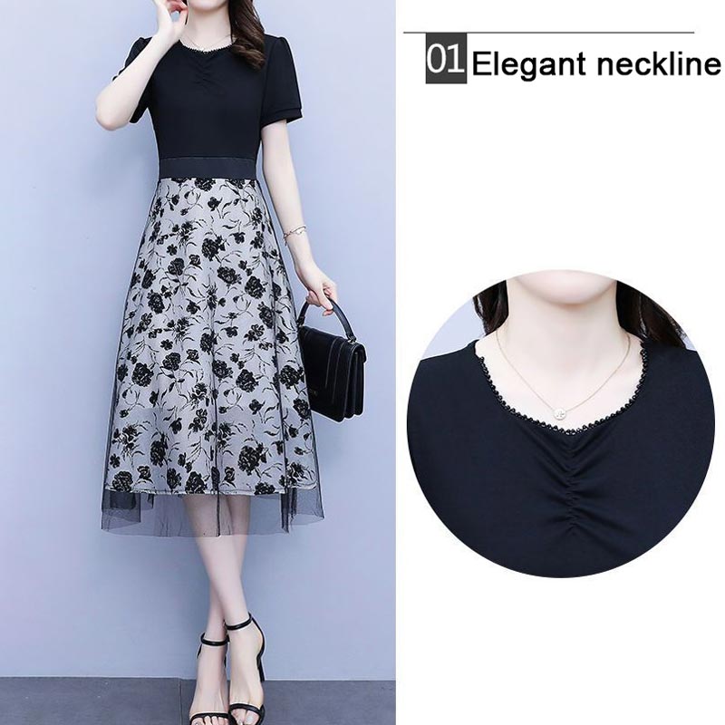 ELEGANTES DESIGN: Das schwarze Kurzarmkleid verfügt über ein einzigartiges Patchwork-Mesh-Kleid, das einen Hauch von Raffinesse und zeitgenössischem Flair verleiht.