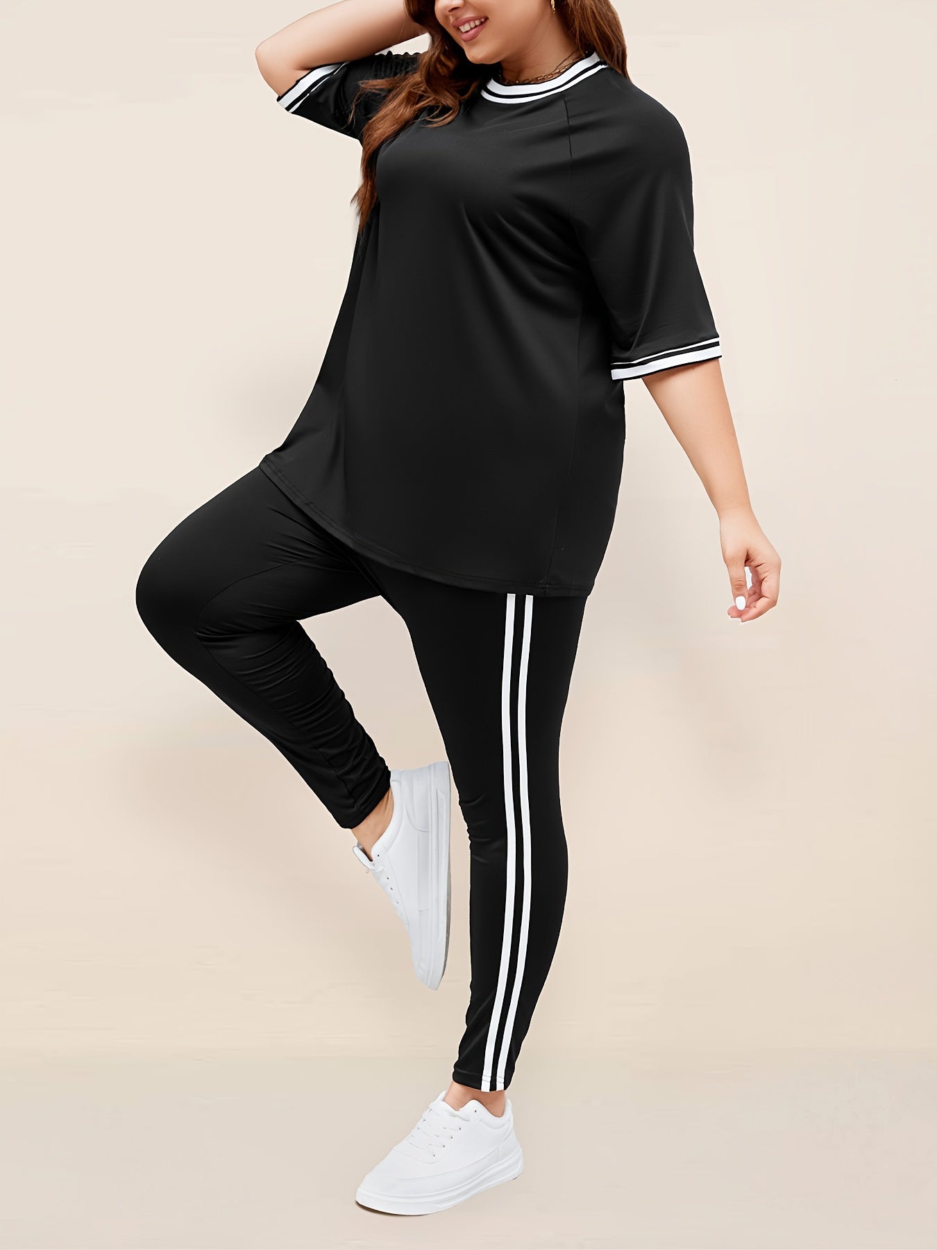 Dieses Set aus schwarzem T-Shirt und Leggings mit weißen Streifen bietet eine elegante Kombination, die sowohl für das Fitnessstudio als auch für den Alltag perfekt ist. Der sportliche Look wird durch praktische Details wie atmungsaktive Materialien und flexible Passformen ergänzt.