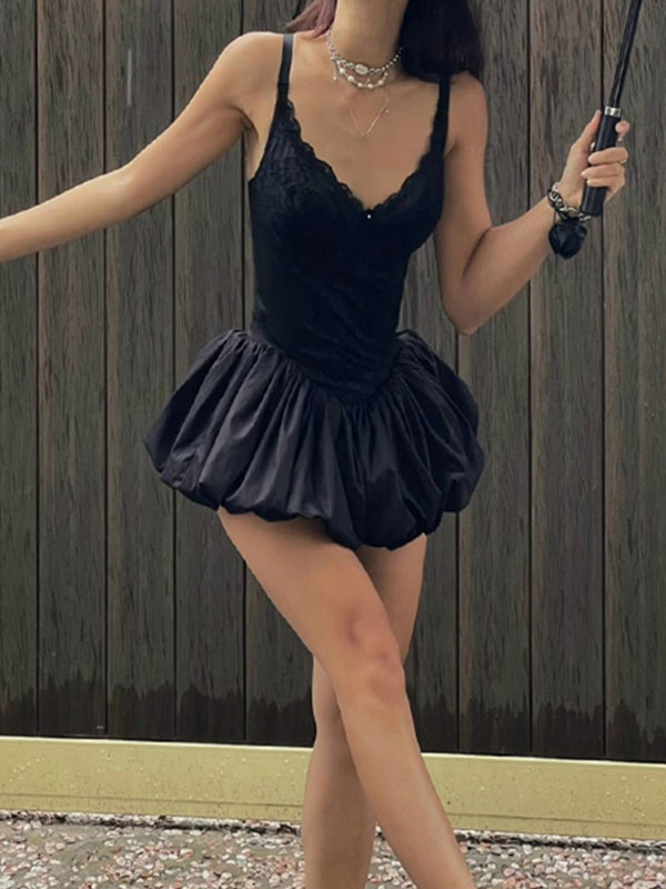 Schwarzes Y2k Lace Stitching V Ausschnitt Mini Kleid