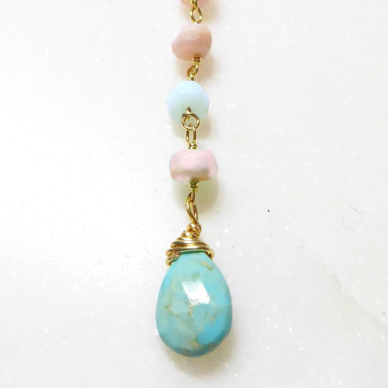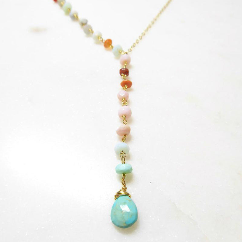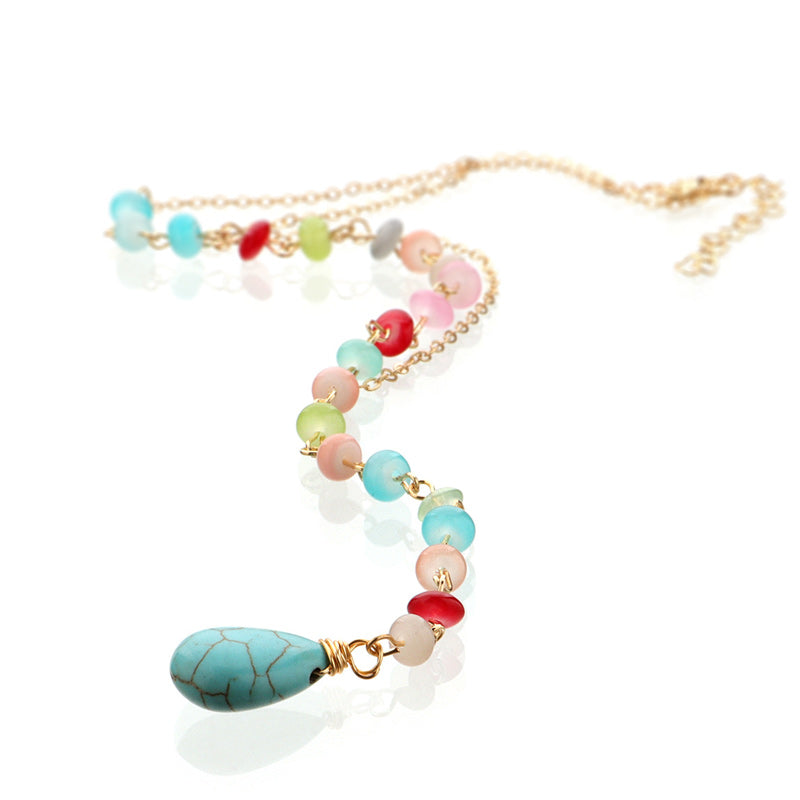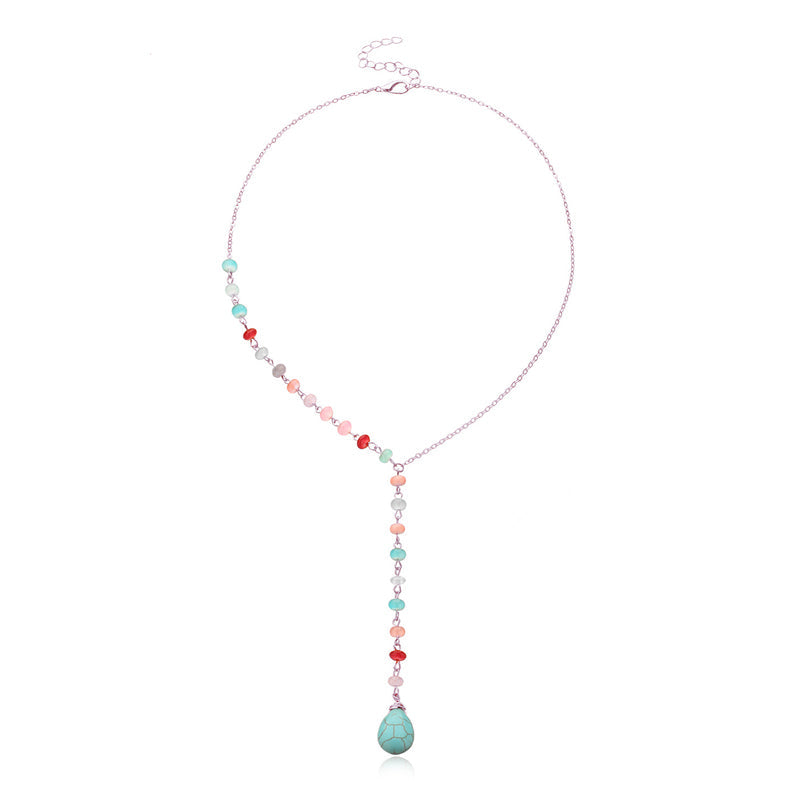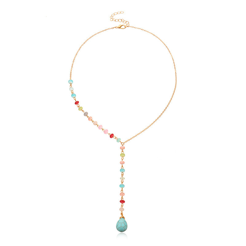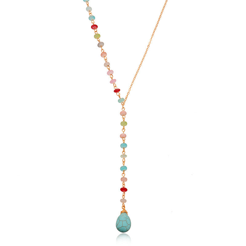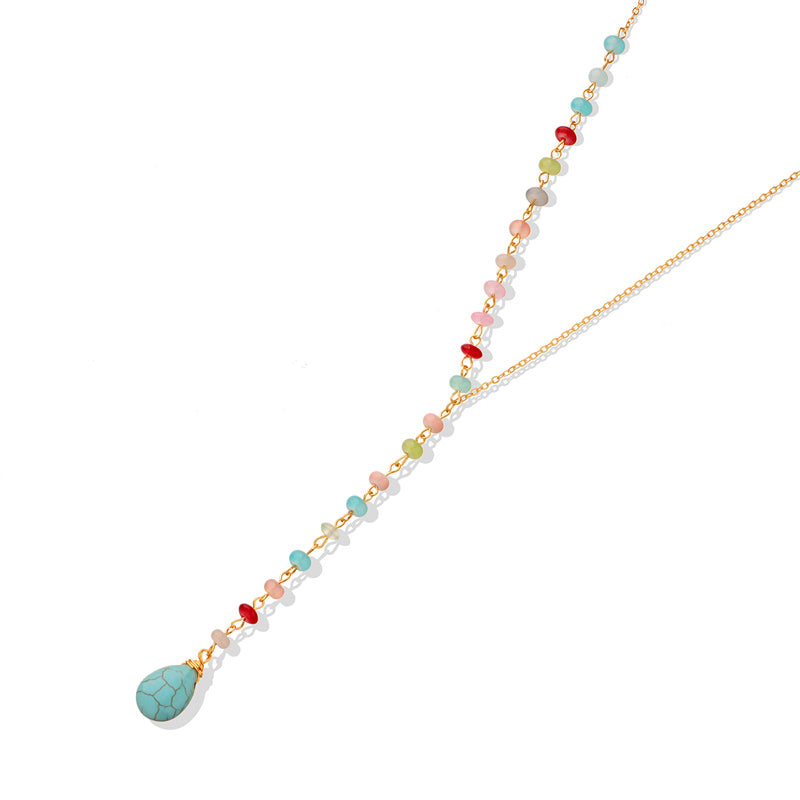 Diese Y-förmige Halskette hat einen kühnen türkisfarbenen Stein, der als Herzstück hängt. Tragen Sie dieses Statement-Piece, um Ihrem Aufstehen einen jugendlichen Charakter zu verleihen.