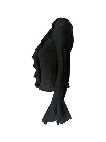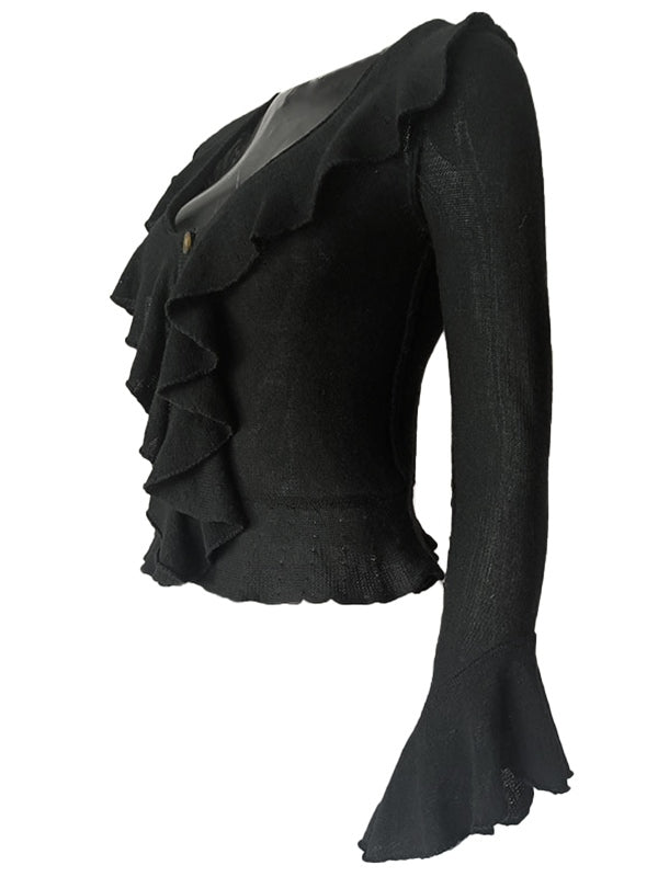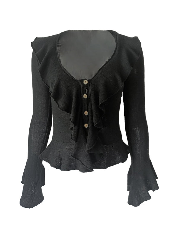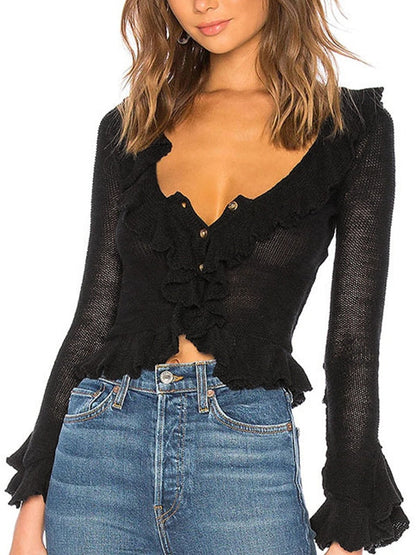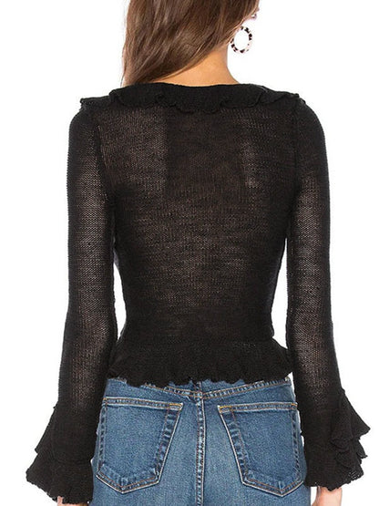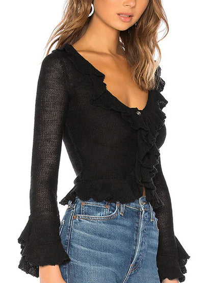 Unifarbenes Vintage V-Ausschnitt Rüschenlangarm Strickpullover