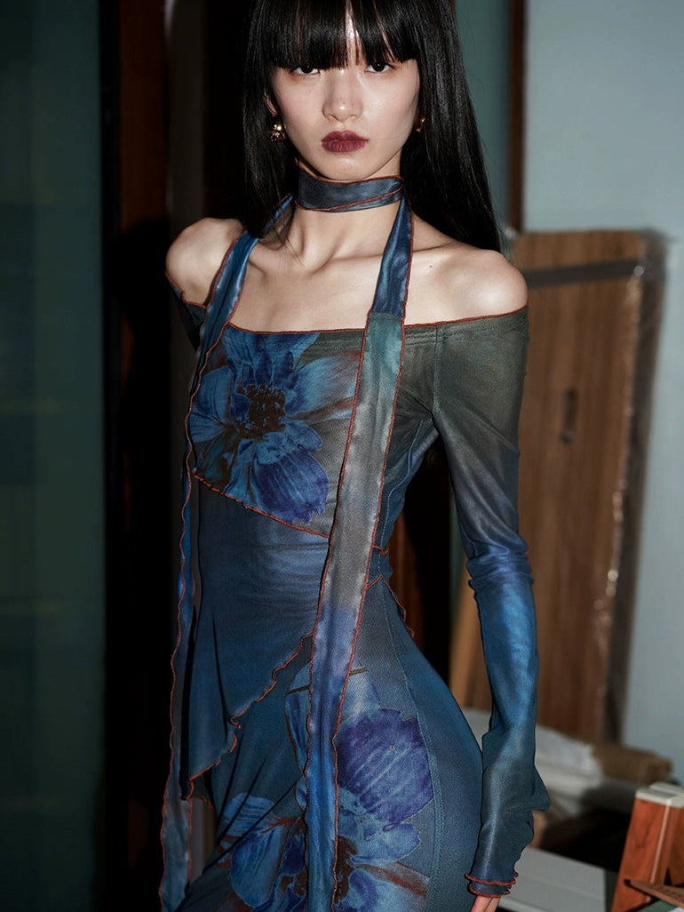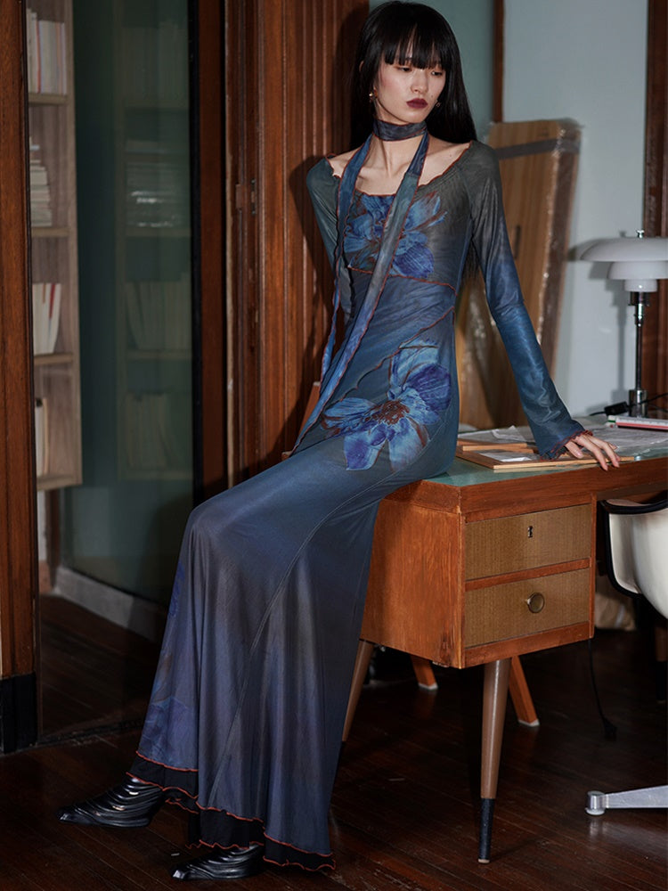 Vintage Schulterfreies Blumenmuster Mesh Slim Maxikleid