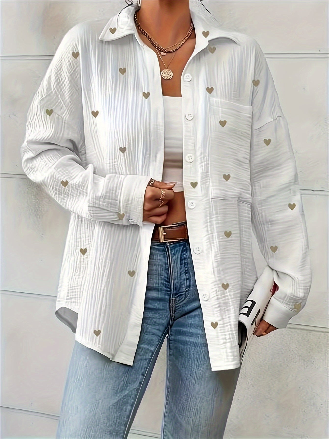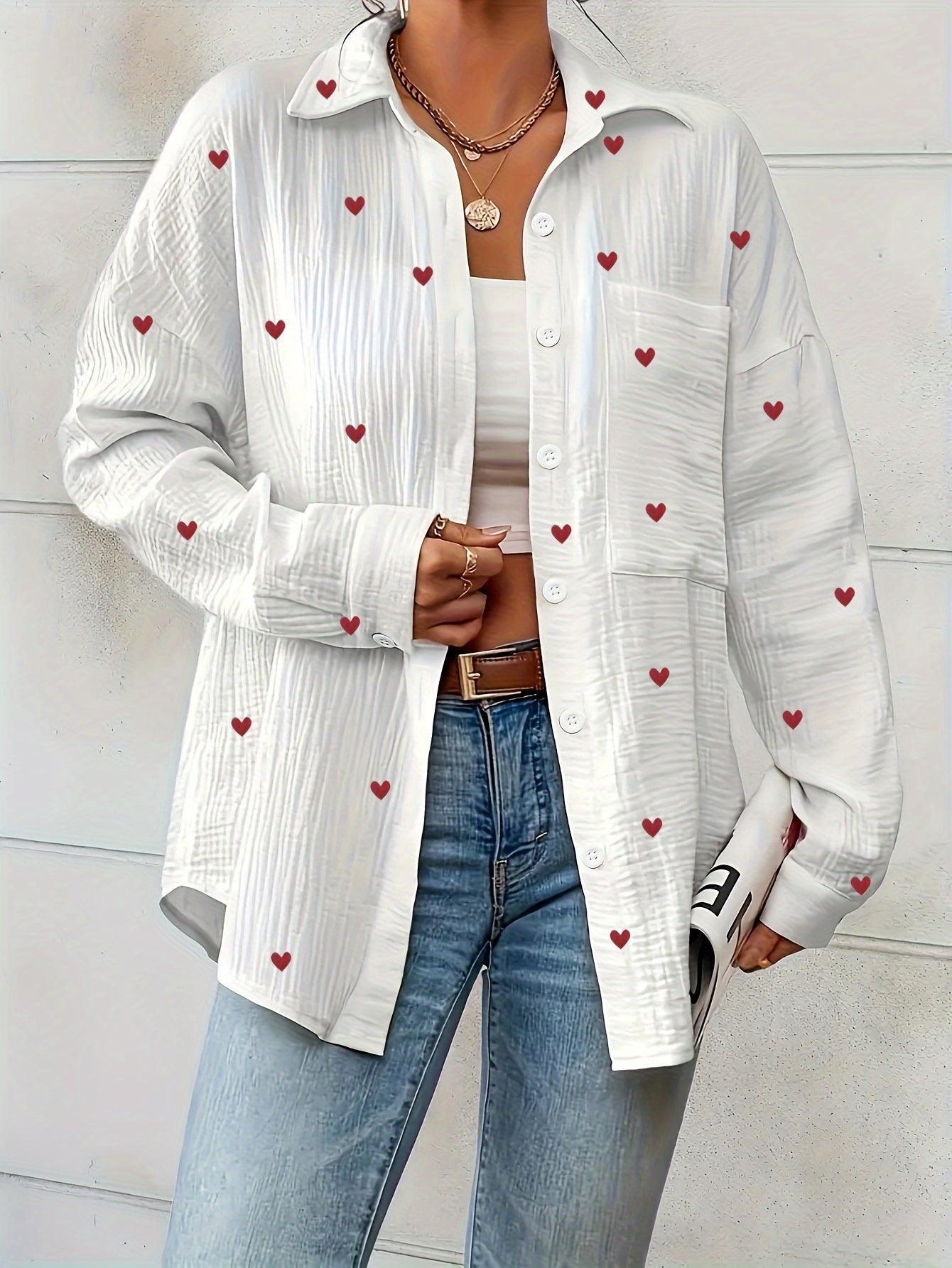 Verspieltes Design mit Herzmotiven: Die roten Herzmuster auf dem weichen weißen Stoff verleihen diesem Hemd einen besonderen, lieblichen Charme. Der lockere Schnitt und die langen Ärmel bieten eine bequeme Passform, während die Knopfleiste und die Brusttasche praktische und stilvolle Details hinzufügen. Dieses Hemd ist ideal, um einen entspannten und dennoch modischen Look zu kreieren.