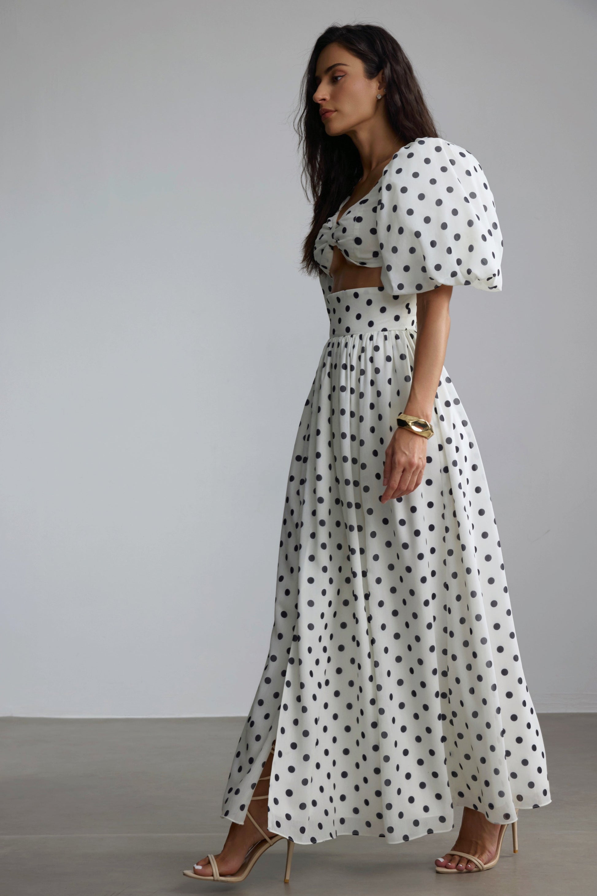 White Polka Dot Maxi Dress with Side Slit for Women - Lelia