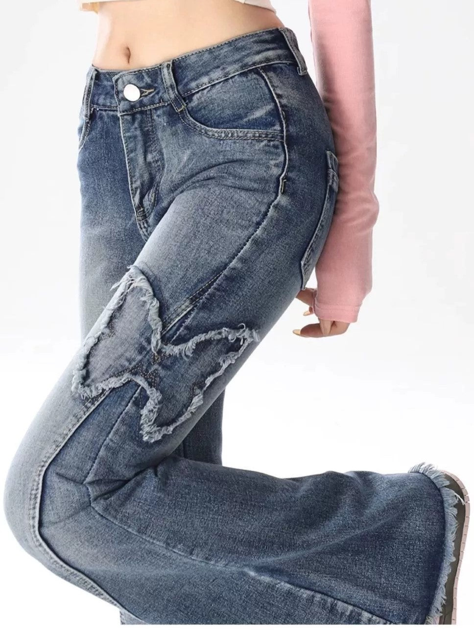 Charmante Schmetterlingsstickerei: Diese Jeans sind mit filigranen Schmetterlingsstickereien verziert, die eine spielerische und märchenhafte Note verleihen. Die zarten Schmetterlinge, strategisch entlang der Beine platziert, setzen farbenfrohe Akzente und erinnern an die ikonische Y2K-Ästhetik.
