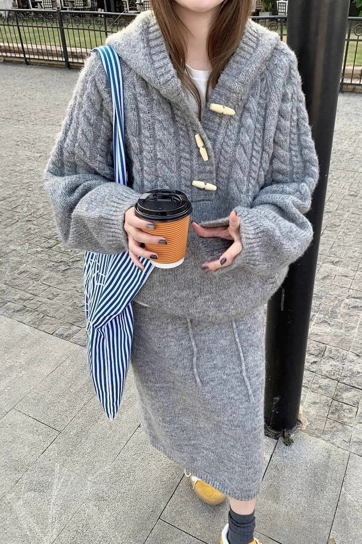 Slouchy loose cable knit hooded top and skirt two-piece set