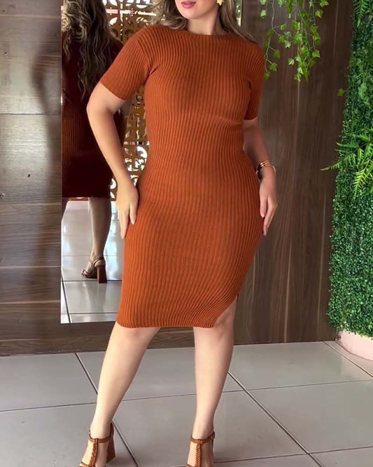 Plain, slim dress with round neckline
