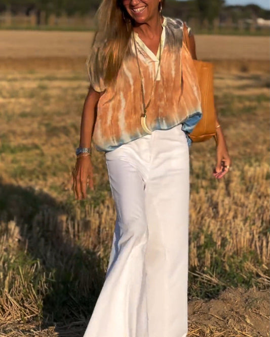 Casual printed v-neck short sleeve blouse
