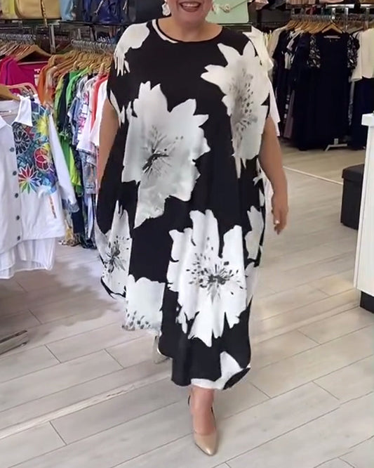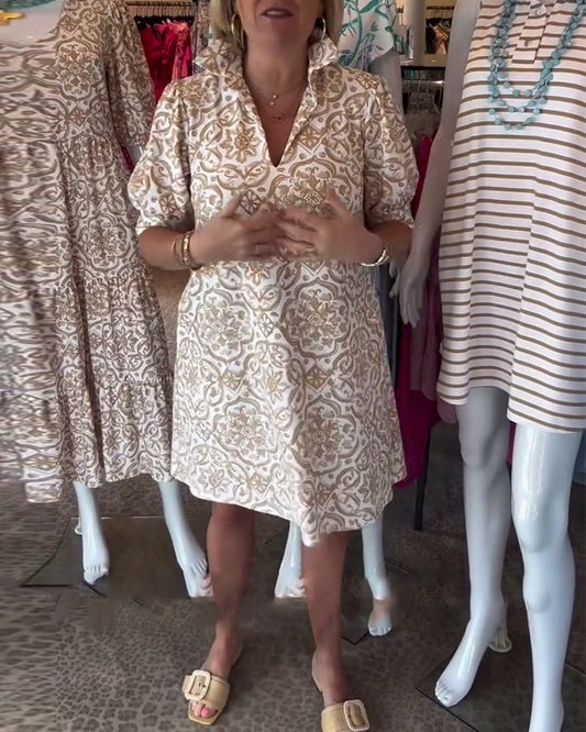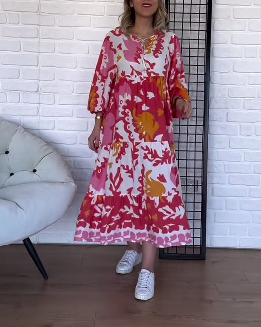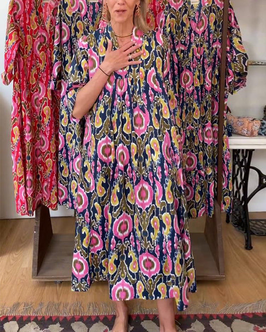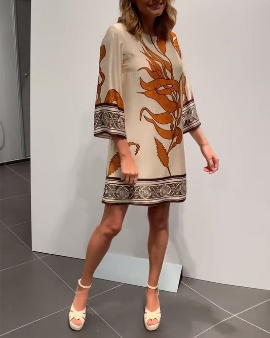 Casual printed loose v-neck three-quarter sleeve dress