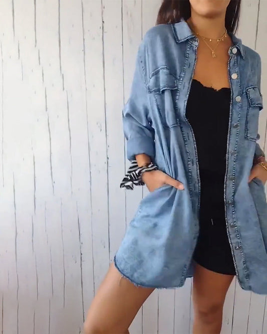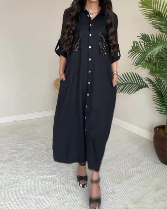 Casual solid color dress with sequins and lapels and buttons