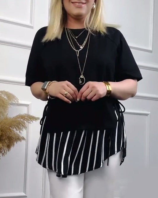 Casual short sleeve top with stripe pattern and patchwork