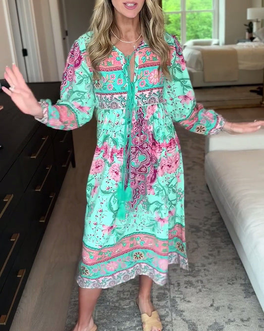 Casual printed patchwork dress with bell sleeves
