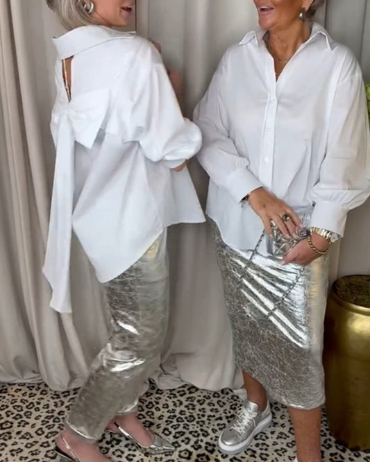 Fashionable solid color long sleeve backless shirt with bow