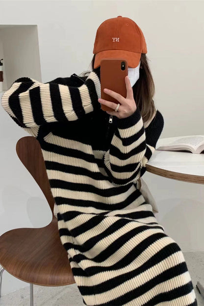 Bringen Sie Ihren Style auf Vordermann und zeigen Sie der Welt, wer der Boss ist, in diesem traumhaften mittellangen Strickkleid! Ausgestattet mit einem halben Rollkragenpullover, kontrastierenden Streifen und einem Reißverschluss, der alles unter Kontrolle hält, sind Sie der Schickste im Raum – und sie werden nicht einmal wissen, was sie getroffen hat!