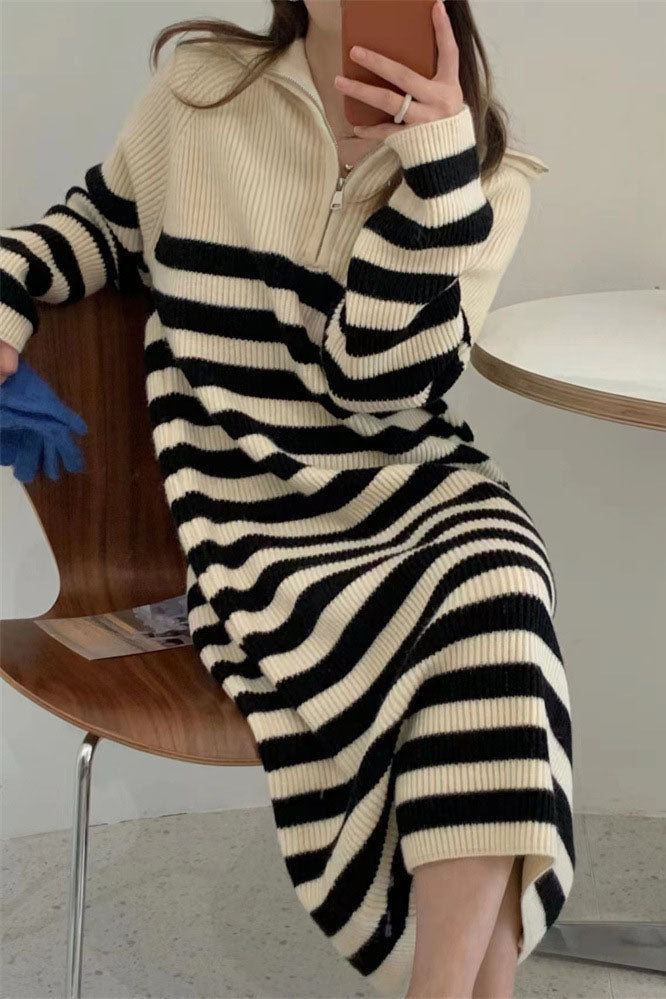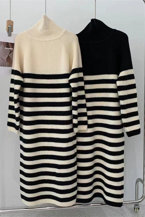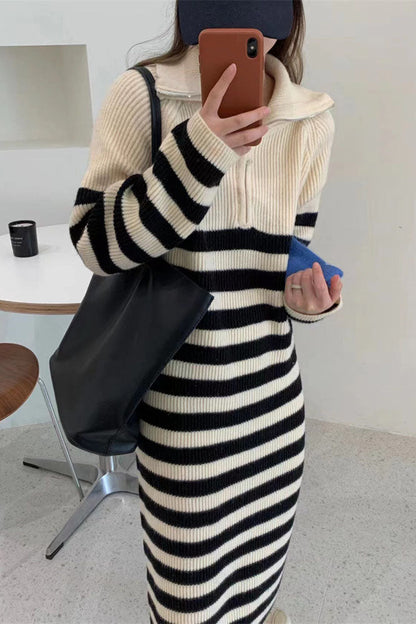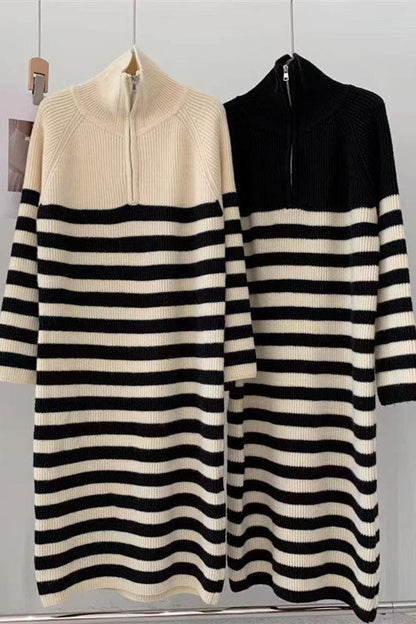 Halblanges Strickkleid mit Rollkragen und kontrastierendem Streifen und Reißverschluss